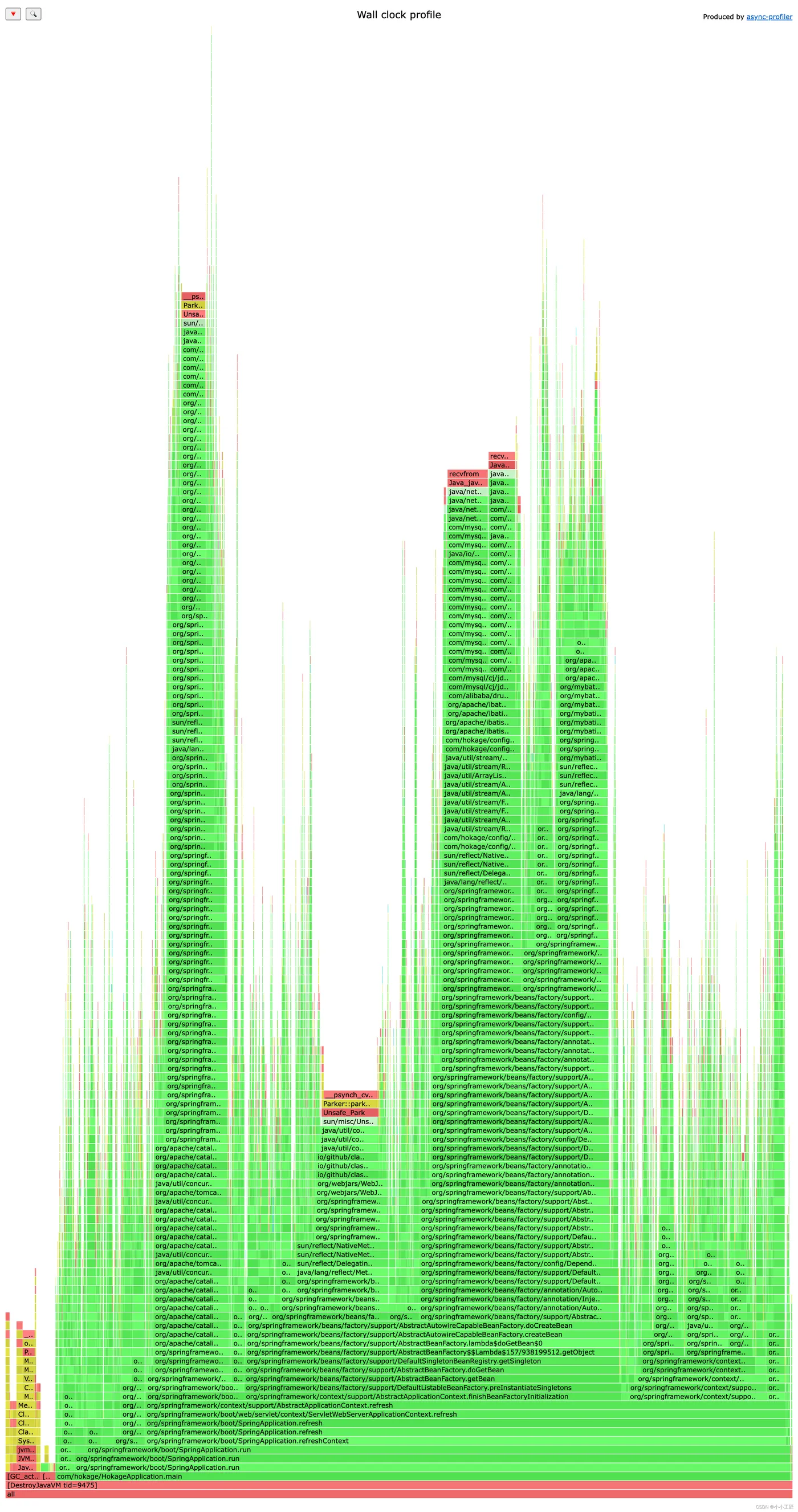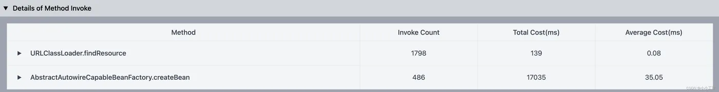 Spring Bean初始化详情信息,支持初始化耗时/beanName搜索、Spring Bean初始化时序图、方法调用次数及耗时统计(支持自定义方法)、应用未加载的jar包(帮助fatjar瘦身)及应用启动过程线程wall clock火焰图,帮助开发者快速分析定位应用启动卡点