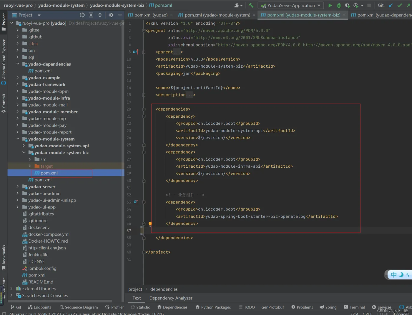 <?xml version="1.0" encoding="UTF-8"?> <project xmlns="http://maven.apache.org/POM/4.0.0" xmlns:xsi="http://www.w3.org/2001/XMLSchema-instance" xsi:schemaLocation="http://maven.apache.org/POM/4.0.0 http://maven.apache.org/xsd/maven-4.0.0.xsd"> <modelVersion>4.0.0</modelVersion> <groupId>cn.iocoder.boot</groupId> <artifactId>yudao-dependencies</artifactId> <version>${revision}</version> <packaging>pom</packaging> <name>${project.artifactId}</name> <description>基础 bom 文件,管理整个项目的依赖版本</description> <url>https://github.com/YunaiV/ruoyi-vue-pro</url> <properties> <revision>1.8.0-snapshot</revision> <!-- 统一依赖管理 --> <spring.boot.version>2.7.13</spring.boot.version> <!-- Web 相关 --> <springdoc.version>1.6.15</springdoc.version> ...... </properties> <dependencyManagement> <dependencies> .... </dependencies> </dependencyManagement> </project>