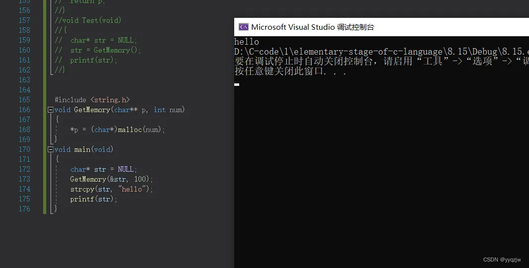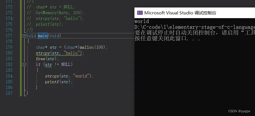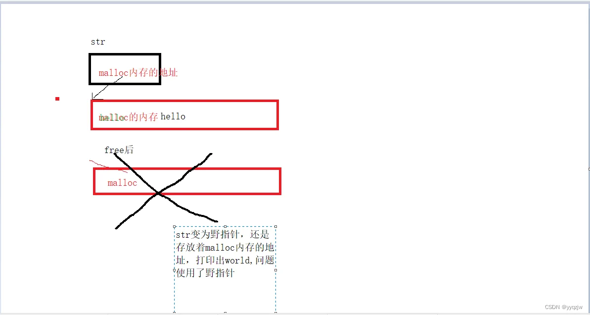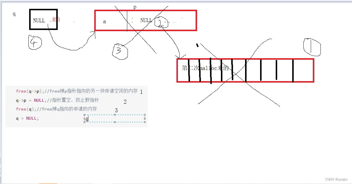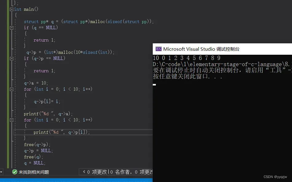 int main() { struct pp* q = (struct pp*)malloc(sizeof(struct pp));//申请结构体大小的内存 if (q == NULL)//判断申请是否成功 { return 1;//异常退出 } q->p = (int*)malloc(10*sizeof(int)); if (q->p == NULL)//判断申请是否成功 { return 1;//异常退出 } q->a = 10;//赋值 for (int i = 0; i < 10; i++) { q->p[i]= i;赋值 } printf("%d ", q->a); for (int i = 0; i < 10; i++) { printf("%d ", q->p[i]); } free(q->p);//free掉p指针指向的另一块申请空间的内存 q->p = NULL;//指针置空,防止野指针 free(q);//free掉q指向的申请的内存 q = NULL; }