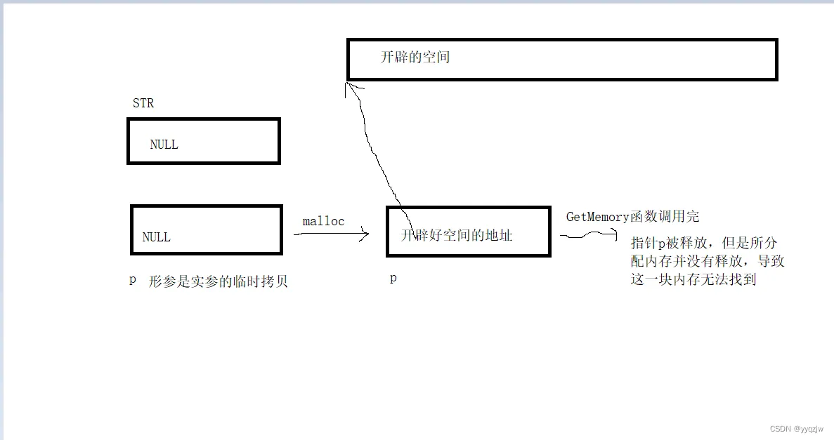 void GetMemory(char *p) { p = (char *)malloc(100); } void Test(void) { char *str = NULL; GetMemory(str); strcpy(str, "hello world"); printf(str); }