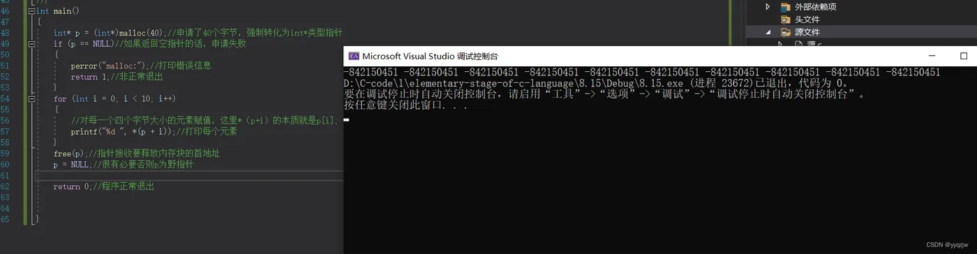 int main() { int i = 0; int*p=(int*) malloc(40); if (p == NULL) { perror("malloc:"); return 1; } for (int i = 0; i < 10; i++) { *(p + i) = i; printf("%d", *(p + i)); } free(p);//指针接收要释放内存块的首地址 p = NULL;//很有必要否则p为野指针 return 0; }