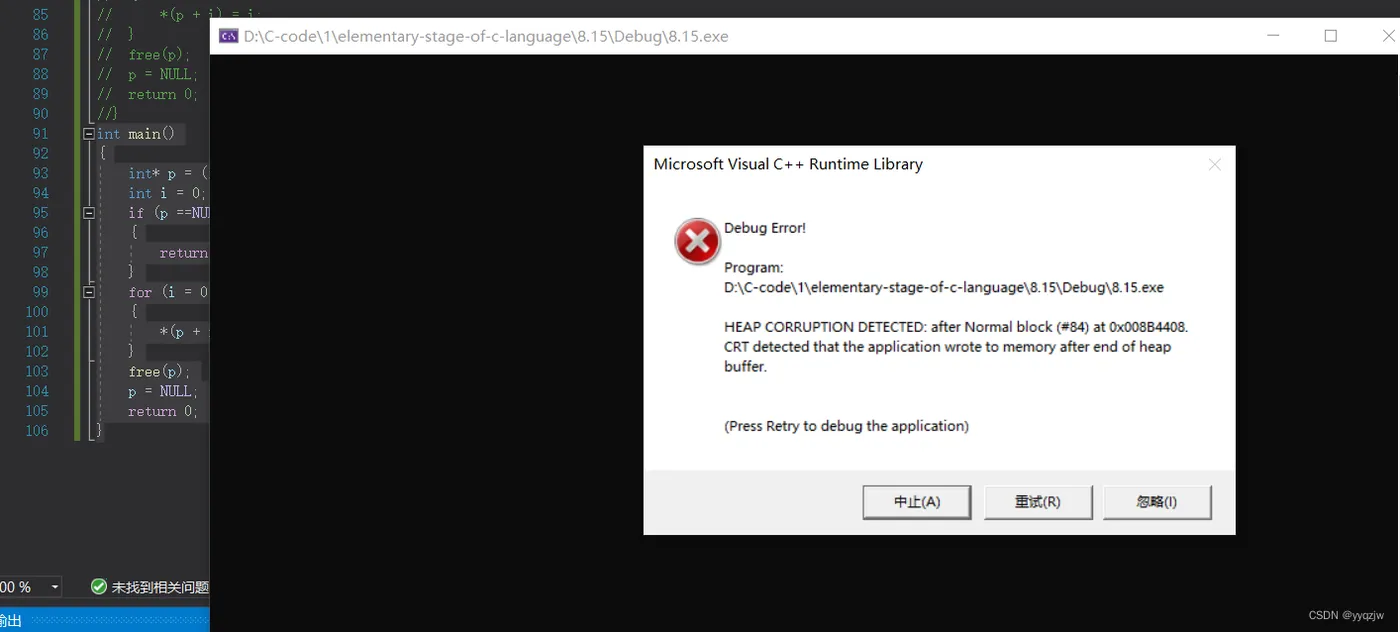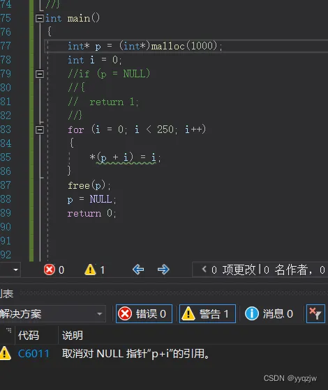 int main() { int* p = (int*)malloc(100); int i = 0; if (p ==NULL) { return 1; } for (i = 0; i <25; i++)//=25变成<25 { *(p + i) = i; } free(p); p = NULL; return 0; }