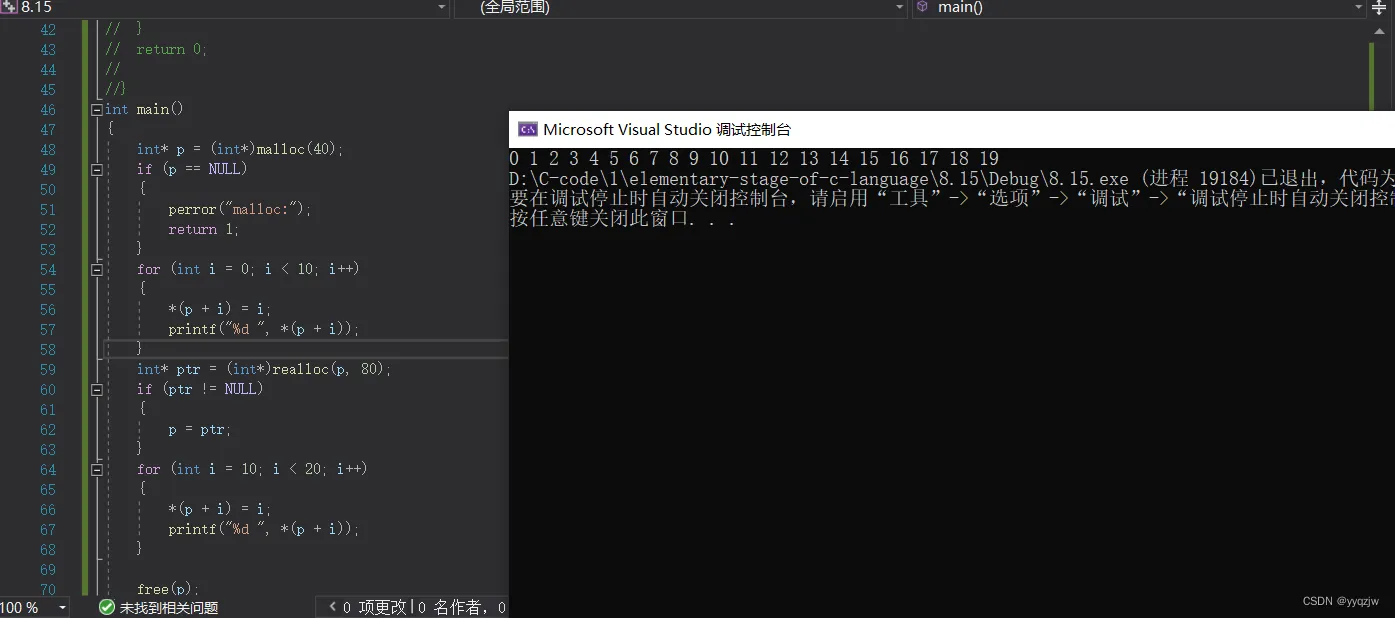 int main() { int* p = (int*)malloc(40);//申请了40个字节,强制转化为int*类型指针 if (p == NULL)//如果返回空指针的话,申请失败 { perror("malloc:");//打印错误信息 return 1;//非正常退出 } for (int i = 0; i < 10; i++)//循环打印扩容前的元素 { *(p + i) = i; printf("%d ", *(p + i)); } int* ptr = (int*)realloc(p, 80);//原空间够用ptr==p,不够用的话ptr存放新地址 if (ptr != NULL)//扩容成功 { p = ptr;//原空间够用ptr==p,不够用的话ptr存放新地址,重新将新地址给p } for (int i = 10; i < 20; i++)//扩容后新空间的 { *(p + i) = i; printf("%d ", *(p + i)); } free(p); p = NULL; return 0; }