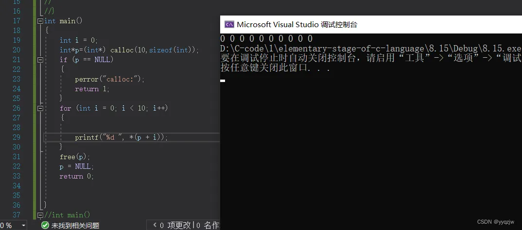int main() { int i = 0; int*p=(int*) calloc(10,sizeof(int));//申请10个元素,每个元素字节大小4 if (p == NULL)//如果返回空指针的话,申请失败 { perror("calloc:");//打印错误信息 return 1;//非正常退出 } for (int i = 0; i < 10; i++) { printf("%d ", *(p + i));//打印初始化的值 } free(p); p = NULL; return 0; }