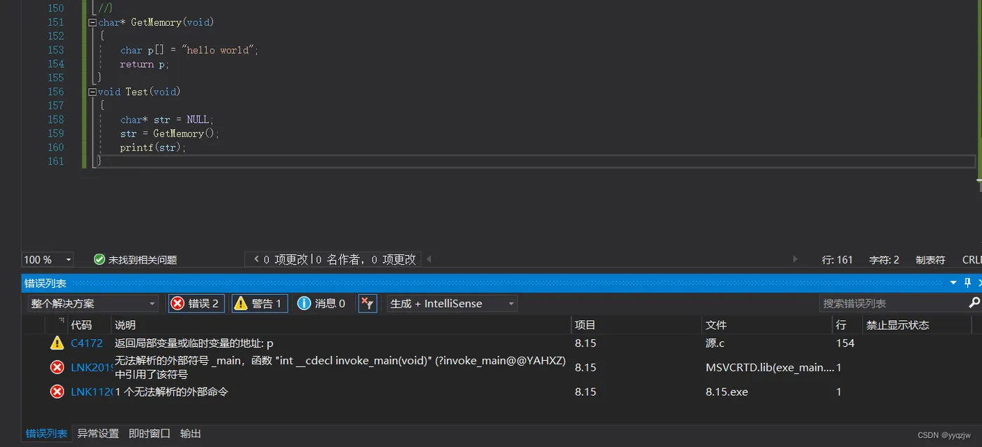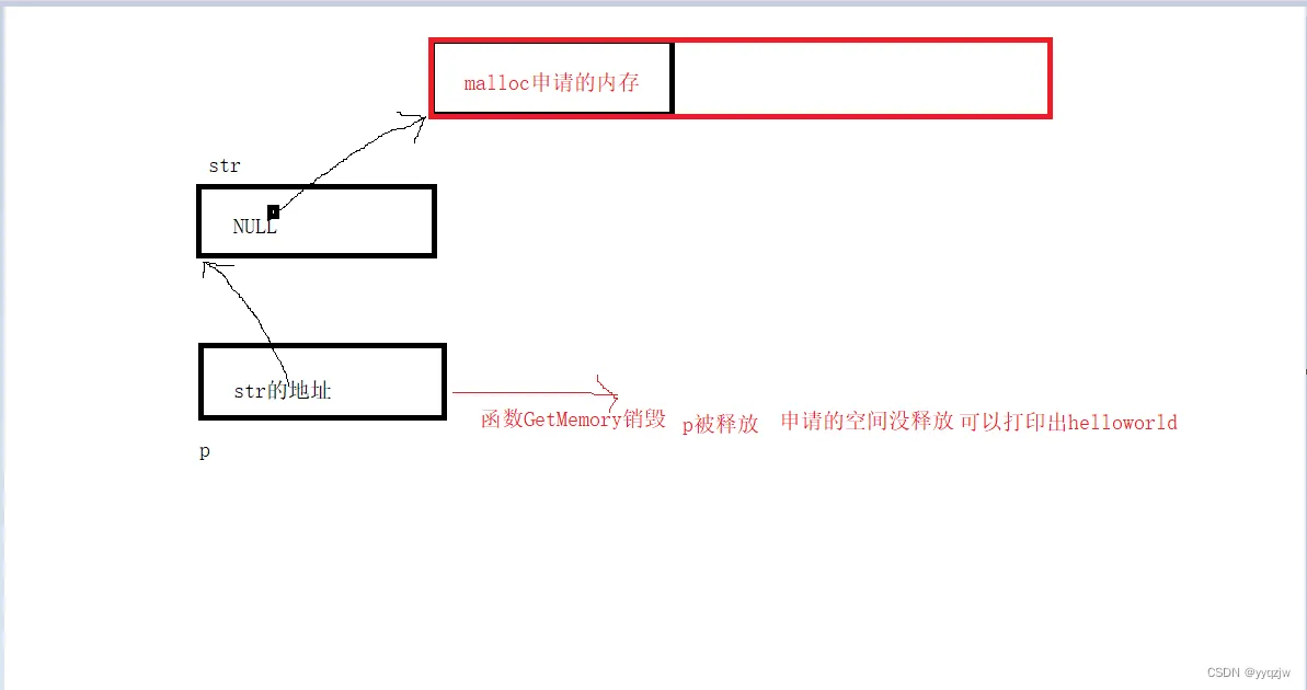 分析:定义一个char*str,让他指向空,str接收GetMemory()函数返回来的地址,进入GetMemory()函数,return p,只能把p[]的首地址传回去,而p[]是局部变量,出GetMemory(),p[]销毁,当你传回去的时候,str接收的是野地址,str为野指针。打印不出来hello world