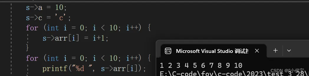 #include<stdio.h> //声明存在柔性数组的结构体 struct SC { int a; char c; int arr[]; /*int arr[0]; 若是编译器报错也可写成该形式*/ }; int main() { //使用malloc函数为带柔性数组的结构体变量进行动态内存分配 struct SC* s = (struct SC*)malloc(sizeof(struct SC) + 10 * sizeof(int)); if (s == NULL) {//判断返回指针是否有效 perror("malloc"); return 1; } else { //使用 s->a = 10; s->c = 'c'; for (int i = 0; i < 10; i++) { s->arr[i] = i+1; } for (int i = 0; i < 10; i++) { printf("%d ", s->arr[i]); } } //释放内存 - 指针置空 free(s); s = NULL; return 0; }