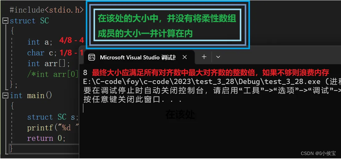 柔性数组在计算大小时是不参与到结构体大小之中的,在结构体中,柔性数组属于一个未知大小的数组,即编译器也不能确定的大小。