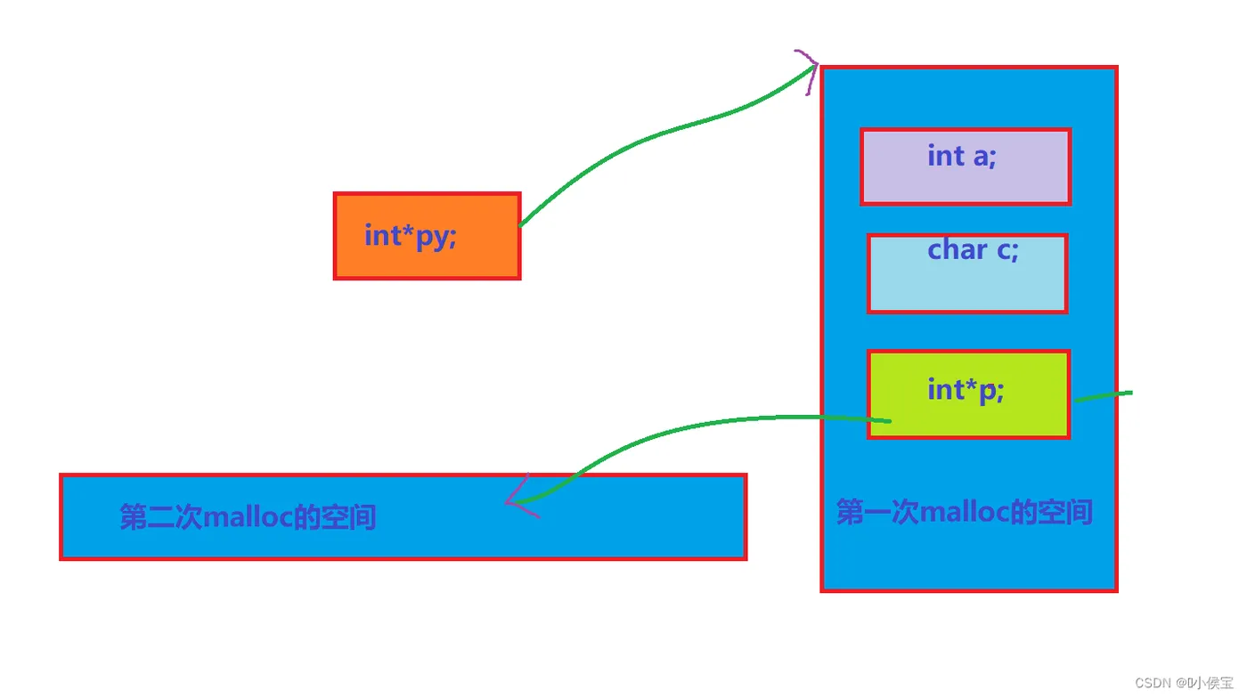 malloc结构体变量的大小存放至结构体指针中,确保可通过结构体指针访问到相应的空间。 - 第二次malloc: