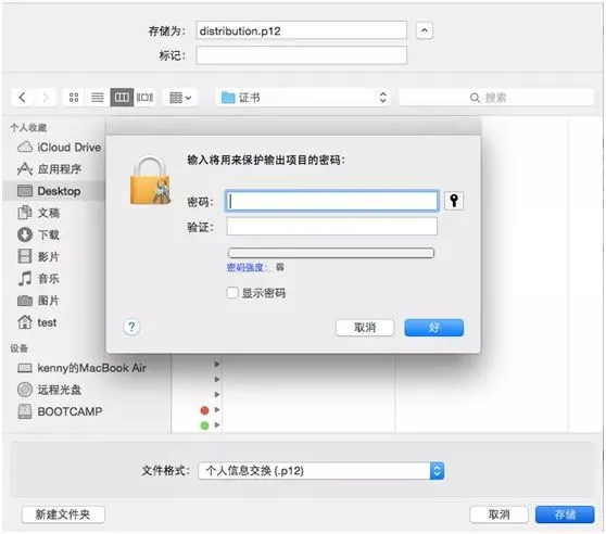 在弹出页面中指定证书名,点击存储,然后输入证书密码(此密码在控制台上传证书页面输入),点击好,生成p12格式证书。