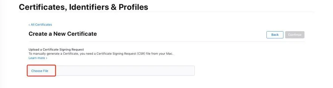 如图,选择Choose File选择之前生成的certSigningRequest文件,点击Continue完成创建