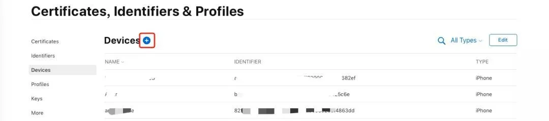 对于个人和公司账号,Ad Hoc类型证书可以安装到指定的测试设备上面调试。如图,点击左侧菜单Profiles,然后点击添加按钮