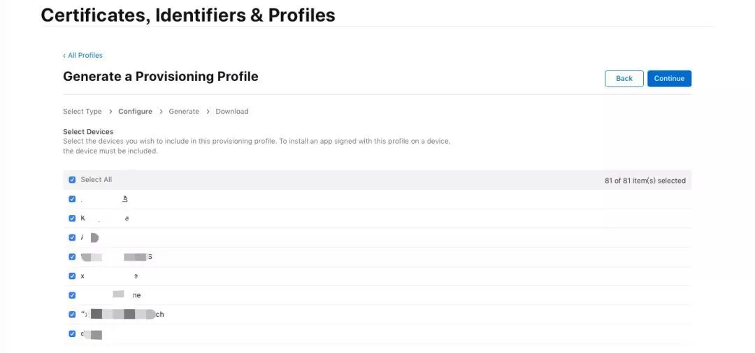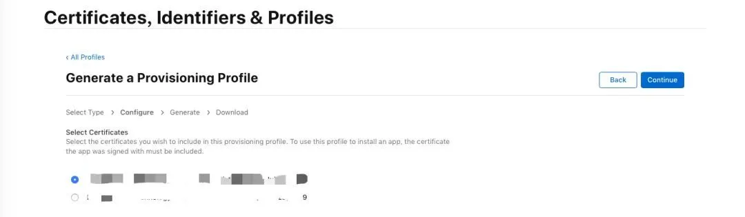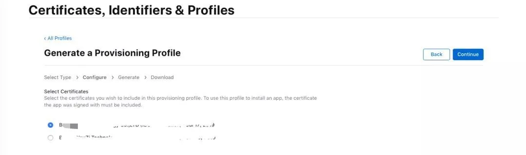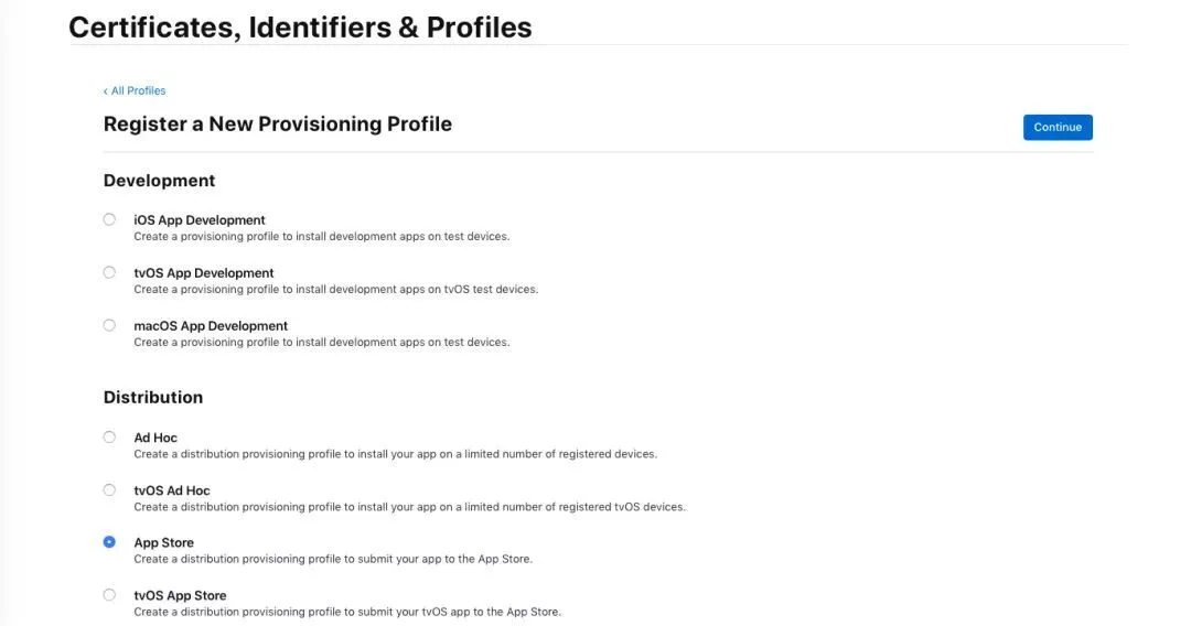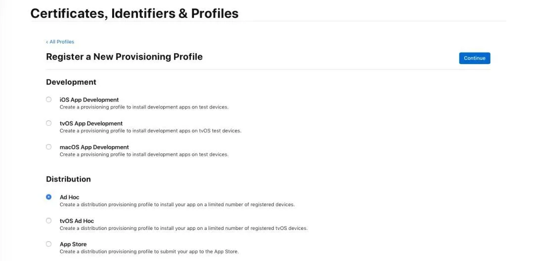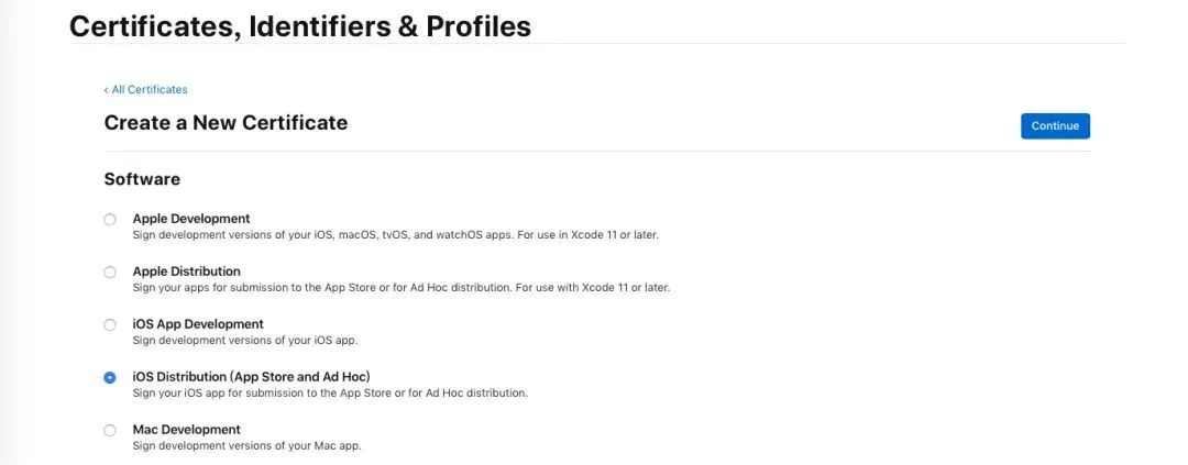 如图,如果是个人或公司账号,选择iOS Distribution (App Store and Ad Hoc),如果是企业账号,则选择In-House and Ad Hoc,点击Continue