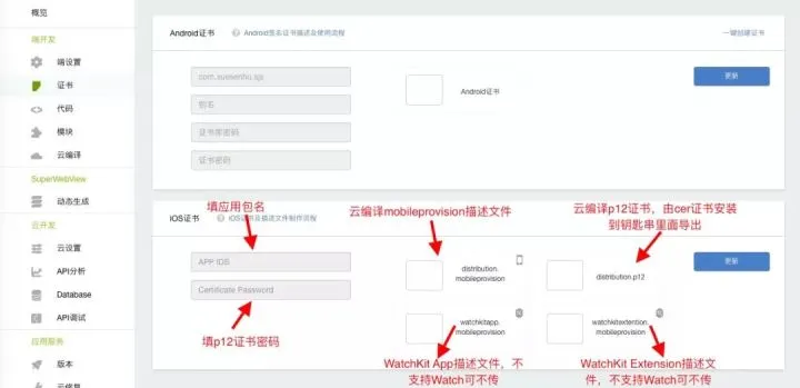 使用APICloud平台开发iOS应用需要用到几个证书,下面的图为各个证书使用的地方。接下来为各个证书的创建教程。