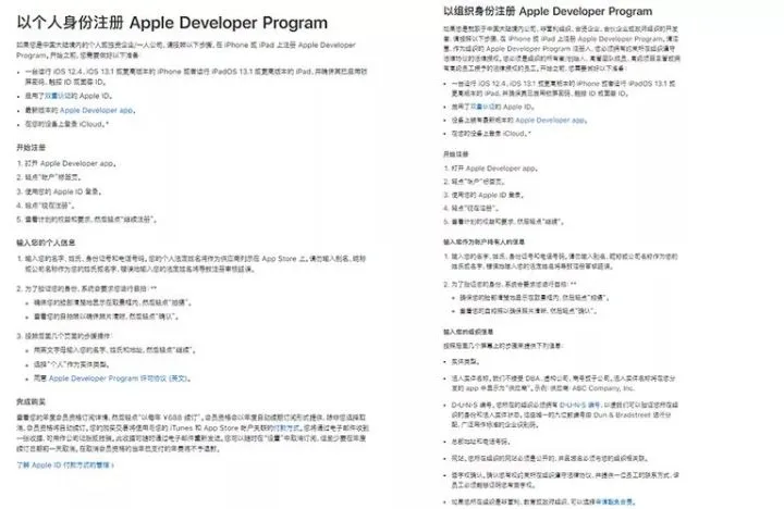 - 个人账号:个人申请用于开发 Apple App 所使用的账号,仅限于个人使用,可以在 App Store 发布应用,申请比较容易,¥688.00/年 ($99.00/year)。