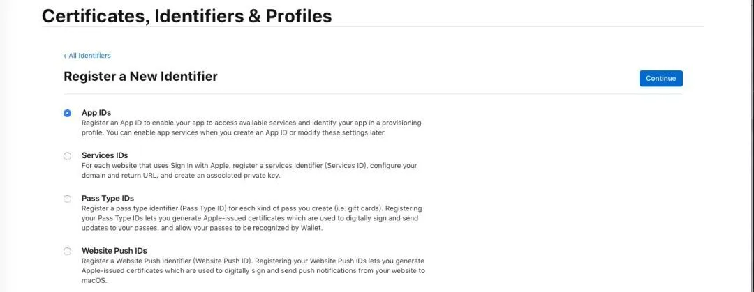 这里以个人、公司账号创建App Store类型发布证书为例,企业账号创建In House类型发布证书类似。