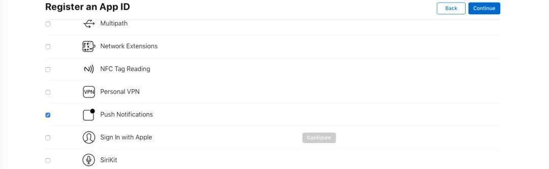 如果应用需要使用推送功能,在下面的Capabilities列表中勾选上Push Notifications项,点击Continue