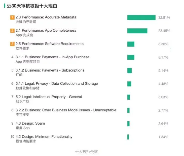下面是七麦数据统计的近30天的被拒条款统计,仅供参考。