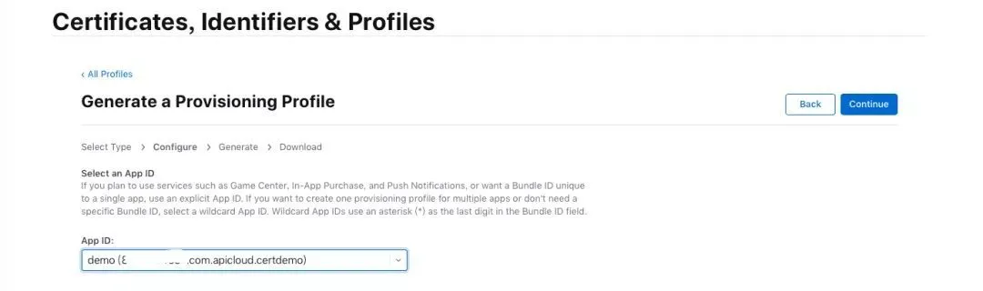 在Bundle ID处选择Explicit,填写自己项目的ID,这里填写的ID即是控制台上传证书页面需要填写的App IDs