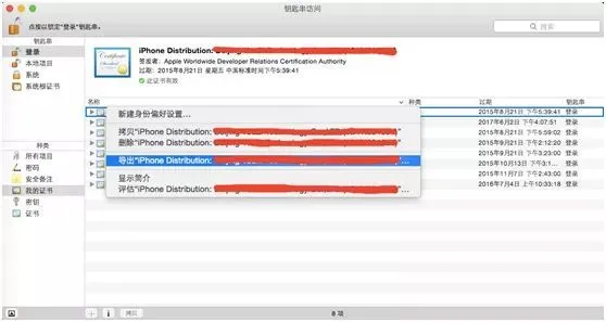 双击打开证书将其安装到钥匙串,若弹出安装提示,选择安装到“登录”,在钥匙串中找到安装的证书,若提示此证书是由未知颁发机构签名的,请下载Apple Worldwide Developer Relations Certification Authority证书进行安装,地址http://developer.apple.com/certificationauthority/AppleWWDRCA.cer,在左边选择“登录”和“我的证书”,找到证书,在证书上面点击鼠标右键,然后在菜单中选择导出证书,如图: