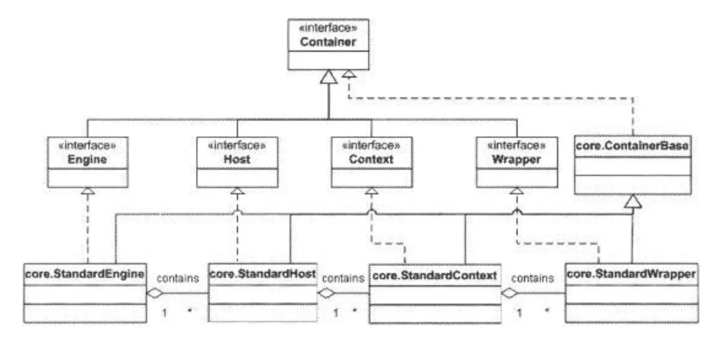 Engine是顶层容器,java程序能够运行是因为有引擎即jvm,很自然的,Engine正是可以配置jvm(jvmRoute="jvm1")。Host是Engine的子容器,Context是Host的子容器,Wrapper是Context的子容器,这4个接口的标准实现分别是StandardEngine、StandardHost、StandardContext、StandardWrapper,她们都在org.apache.catalina.core包类,分析tomcat容器正式主要分析这4个类。下图展示了Container接口及其子接口和实现类的UML类图。