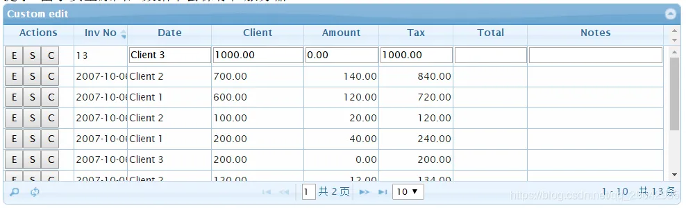 $(function(){ pageInit(); }); function pageInit(){ jQuery("#rowed2").jqGrid( { url : ctx+'/JSONData', datatype : "json", colNames : [ 'Actions', 'Inv No', 'Date', 'Client','Amount', 'Tax', 'Total', 'Notes' ], colModel : [ {name : 'act',index : 'act',width : 75,sortable : false}, {name : 'id',index : 'id',width : 55}, {name : 'invdate',index : 'invdate',width : 90,editable : true}, {name : 'name',index : 'name',width : 100,editable : true}, {name : 'amount',index : 'amount',width : 80,align : "right",editable : true}, {name : 'tax',index : 'tax',width : 80,align : "right",editable : true}, {name : 'total',index : 'total',width : 80,align : "right",editable : true}, {name : 'note',index : 'note',width : 150,sortable : false,editable : true} ], rowNum : 10, rowList : [ 10, 20, 30 ], pager : '#prowed2', sortname : 'id', viewrecords : true, sortorder : "desc", gridComplete : function() { var ids = jQuery("#rowed2").jqGrid('getDataIDs'); for ( var i = 0; i < ids.length; i++) { var cl = ids[i]; be = "<input style='height:22px;width:20px;' type='button' value='E' onclick=\"jQuery('#rowed2').editRow('" + cl + "');\" />"; se = "<input style='height:22px;width:20px;' type='button' value='S' onclick=\"jQuery('#rowed2').saveRow('" + cl + "');\" />"; ce = "<input style='height:22px;width:20px;' type='button' value='C' onclick=\"jQuery('#rowed2').restoreRow('" + cl + "');\" />"; jQuery("#rowed2").jqGrid('setRowData', ids[i], { act : be + se + ce }); } }, editurl : ctx+"/RowEditing", caption : "Custom edit " }); jQuery("#rowed2").jqGrid('navGrid', "#prowed2", { edit : false, add : false, del : false }); }