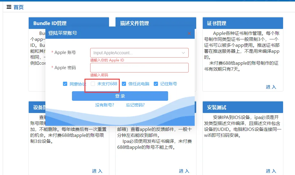 5.登录刚刚申请的苹果账号 ,要选未支付688(正式的开发者账号每年要支付