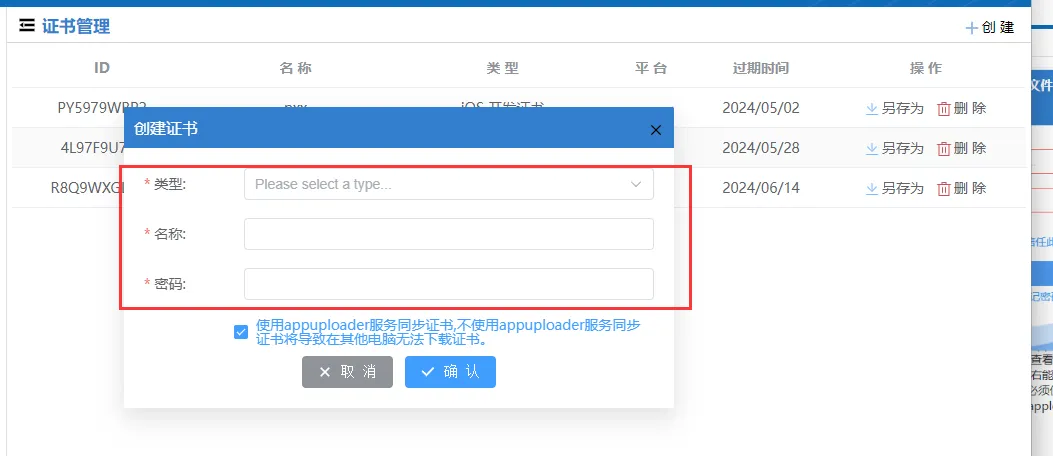 7.进入证书管理,创建证书,名称密码随便填,但密码要记住,对应的是hbuilder
