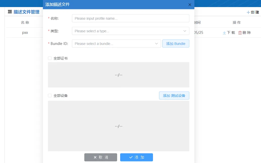 8.进入描述文件管理,添加描述文件,名称随意,类型选择对应的就行,证书和设