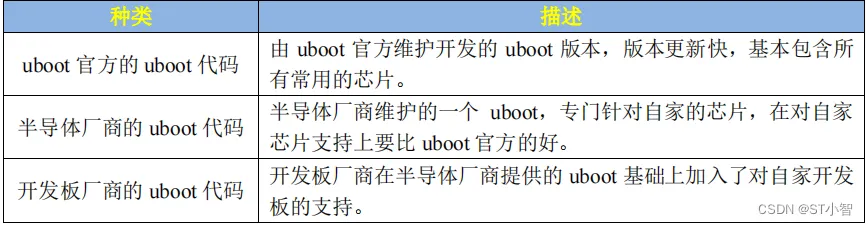 那么这三种uboot该如何选择呢?首先uboot官方的基本是不会用的,因为支持太弱了。最常用的就是半导体厂商或开发板厂商的uboot,如果你用的半导体厂商的评估板,那么就使 用半导体厂商的 uboot,如果你是购买的第三方开发板,就使用开发板厂商的uboot。