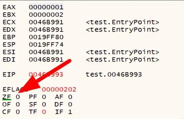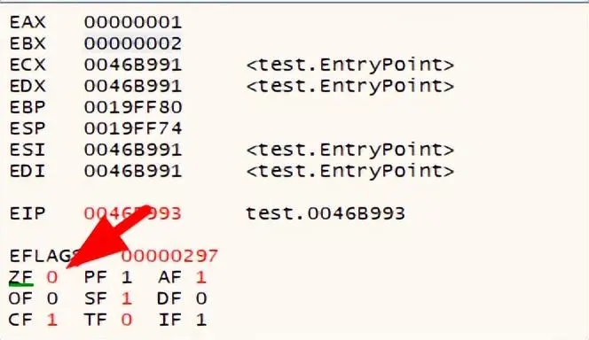 比较两个操作数,如果两个数相等,zf标志位就为1,将eax,ebx的值置为1,执行下面指令,je这个跳转指令就会根据zf标志位进行跳转