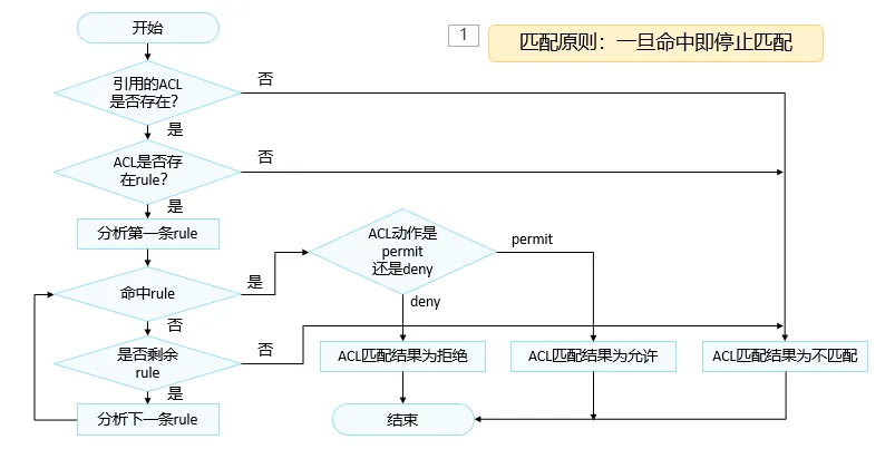 - 一旦匹配上,则设备会对该报文执行这条规则中定义的处理动作,并且不再继续尝试与后续规则匹配。