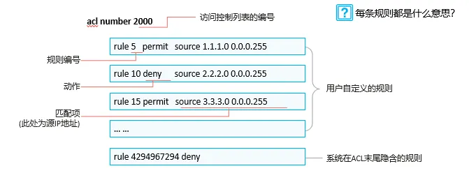 - ACL如果都没有匹配到,则最后隐藏着一个rule deny语句