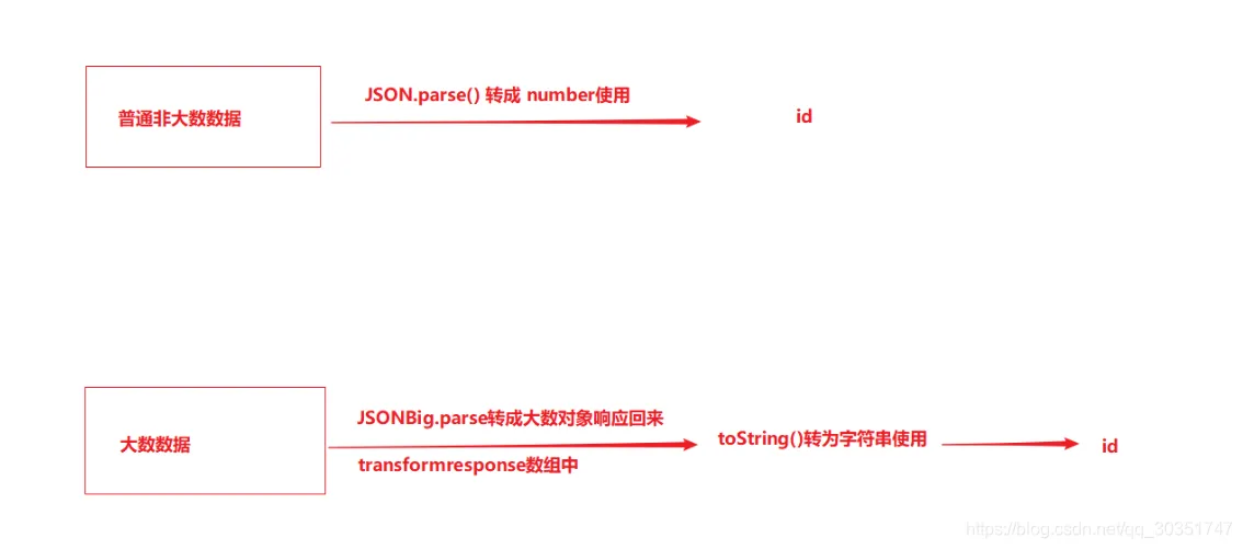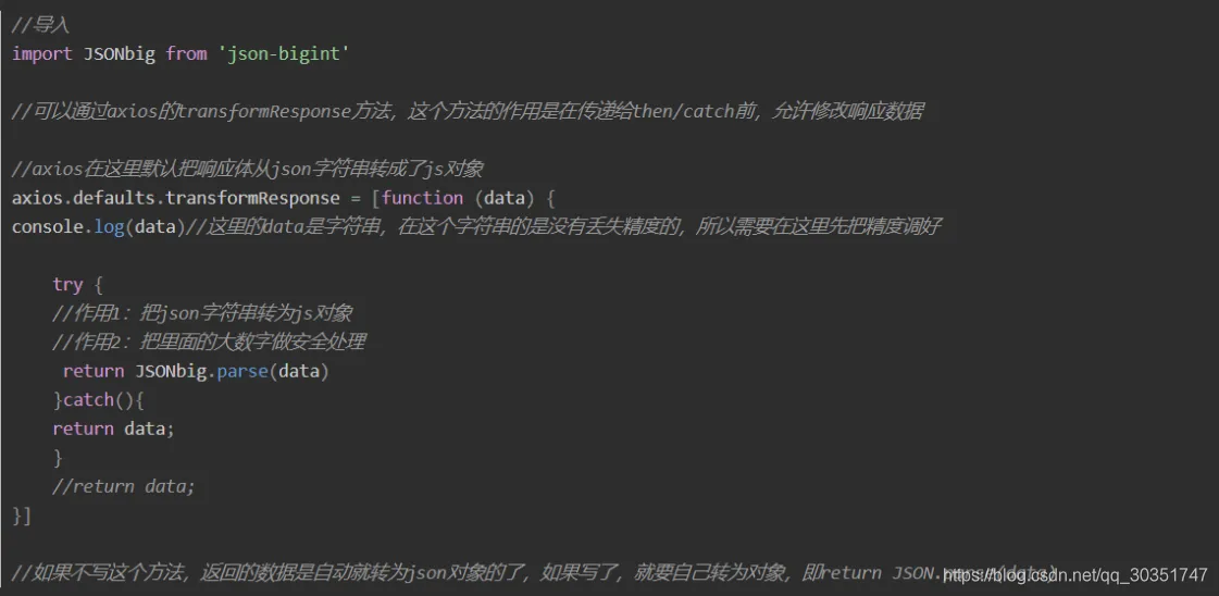 - 响应回来数据,在响应拦截器之前,进入响应处理函数transformresponse中,使用JSONBig.parse将响应数据转为一个大数的对象