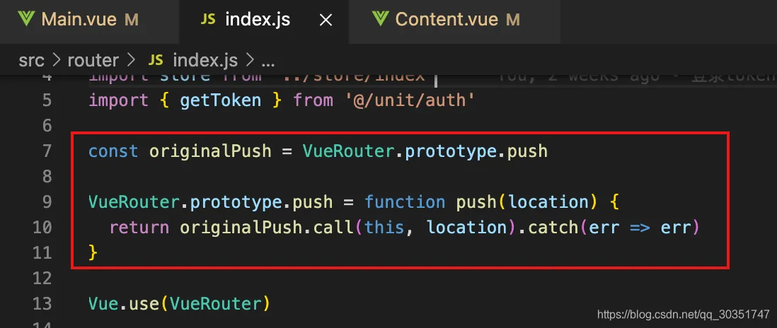 const originalPush = VueRouter.prototype.push VueRouter.prototype.push = function push(location) { return originalPush.call(this, location).catch(err => err) }