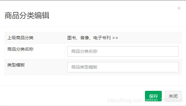 <div class="modal-body"> <table class="table table-bordered table-striped" width="800px"> <tr> <td>上级商品分类</td> <td> {{entity_1.name}} >> {{entity_2.name}} </td> </tr> <tr> <td>商品分类名称</td> <td><input class="form-control" ng-model="entity.name" placeholder="商品分类名称"> </td> </tr> <tr> <td>类型模板</td> <td> <input ng-model="entity.typeId" placeholder="商品类型模板" class="form-control" type="text"/> </td> </tr> </table> </div> <div class="modal-footer"> <button class="btn btn-success" data-dismiss="modal" aria-hidden="true" ng-click="save()">保存</button> <button class="btn btn-default" data-dismiss="modal" aria-hidden="true"关闭</button> </div>