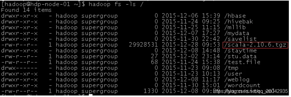 上传文件,命令: Hadoop fs -put ./ scala-2.10.6.tgz to /