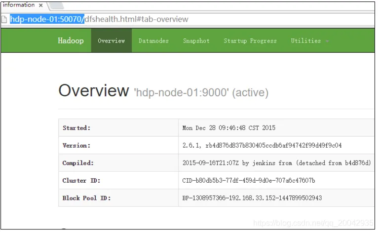 也可打开web控制台查看HDFS集群信息,在浏览器打开http://hdp-node-01:50070/