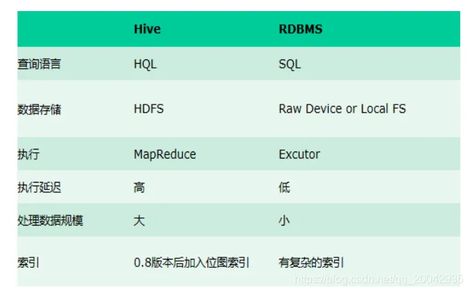 2.数据存储位置 :Hive 是建立在 Hadoop 之上的,所有 Hive 的数据都是存储在 HDFS 中的。而数据库则可以将数据保存在块设备或者本地文件系统中。