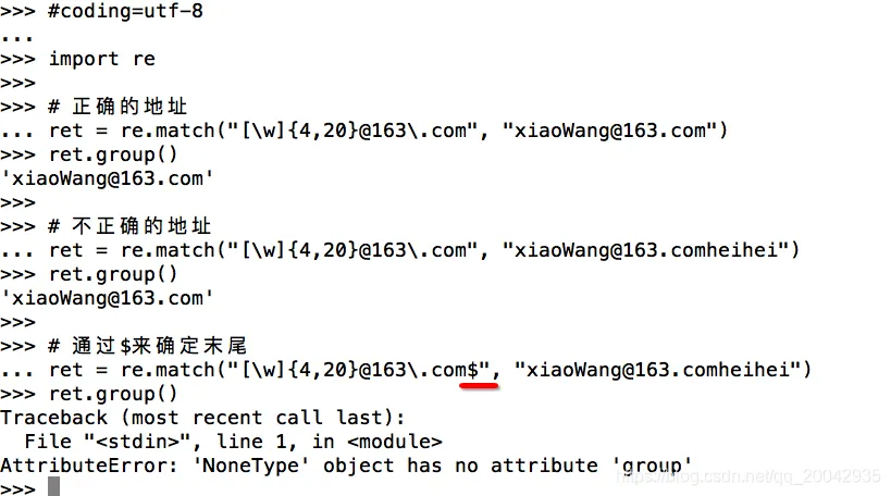 #coding=utf-8 import re # 正确的地址 ret = re.match("[\w]{4,20}@163\.com", "xiaoWang@163.com") ret.group() # 不正确的地址 ret = re.match("[\w]{4,20}@163\.com", "xiaoWang@163.comheihei") ret.group() # 通过$来确定末尾 ret = re.match("[\w]{4,20}@163\.com$", "xiaoWang@163.comheihei") ret.group()