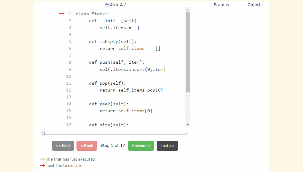 class Stack(object): """栈""" def __init__(self): self.items = [] def is_empty(self): """判断是否为空""" return self.items == [] def push(self, item): """加入元素""" self.items.append(item) def pop(self): """弹出元素""" return self.items.pop() def peek(self): """返回栈顶元素""" return self.items[len(self.items)-1] def size(self): """返回栈的大小""" return len(self.items) if __name__ == "__main__": stack = Stack() stack.push("hello") stack.push("world") stack.push("itcast") print stack.size() print stack.peek() print stack.pop() print stack.pop() print stack.pop()