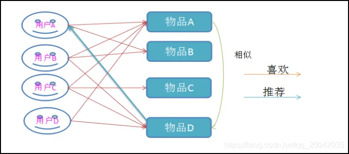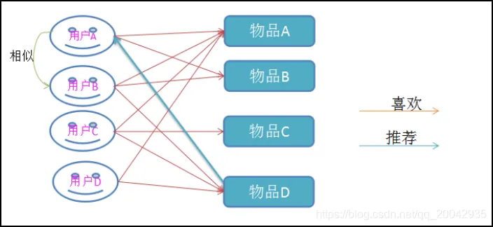 因此,为“用户A”推荐物品时可参考“用户B”的偏好,从而推荐D