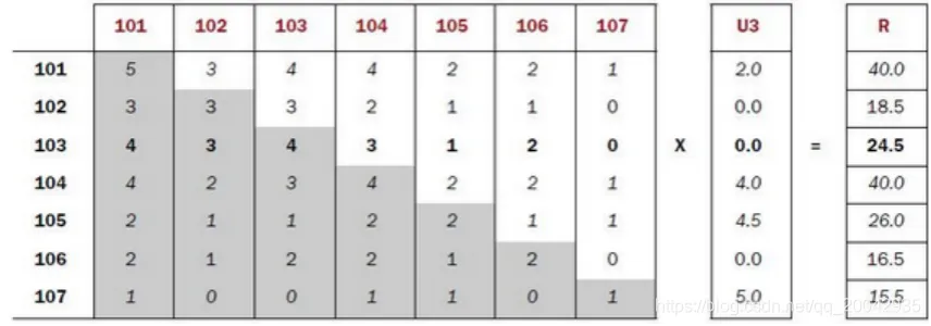 行表示三名用户,列表示三个品牌,对品牌的喜爱度按照1~5增加。