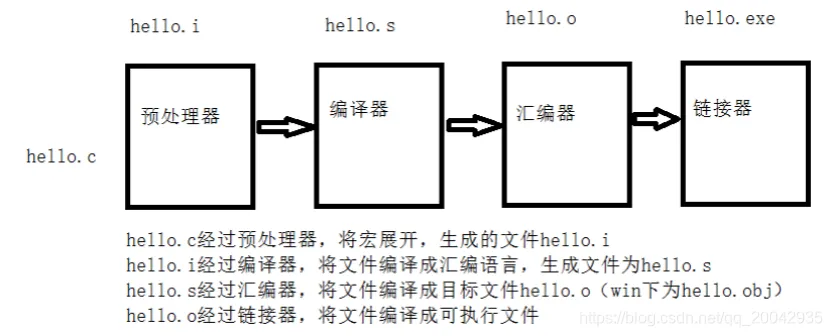 预处理(Pre-processing) -> 编译(Compiling) ->汇编(Assembling) -> 链接(Linking)