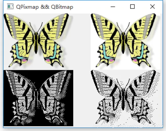 void PaintWidget::paintEvent(QPaintEvent *) { QPixmap pixmap(":/Image/butterfly.png"); QPixmap pixmap1(":/Image/butterfly1.png"); QBitmap bitmap(":/Image/butterfly.png"); QBitmap bitmap1(":/Image/butterfly1.png"); QPainter painter(this); painter.drawPixmap(0, 0, pixmap); painter.drawPixmap(200, 0, pixmap1); painter.drawPixmap(0, 130, bitmap); painter.drawPixmap(200, 130, bitmap1); }