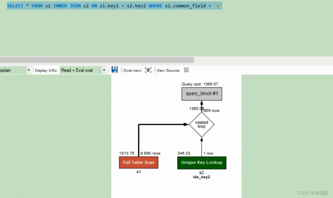 -> Nested loop inner join (cost=4130.67 rows=8905) -> Filter: ((s2.common_field is not null) and (s2.key1 is not null)) (cost=1013.75 rows=8905) -> Table scan on s2 (cost=1013.75 rows=9895) -> Index lookup on s1 using idx_key1 (key1=s2.key1) (cost=0.25 rows=1)