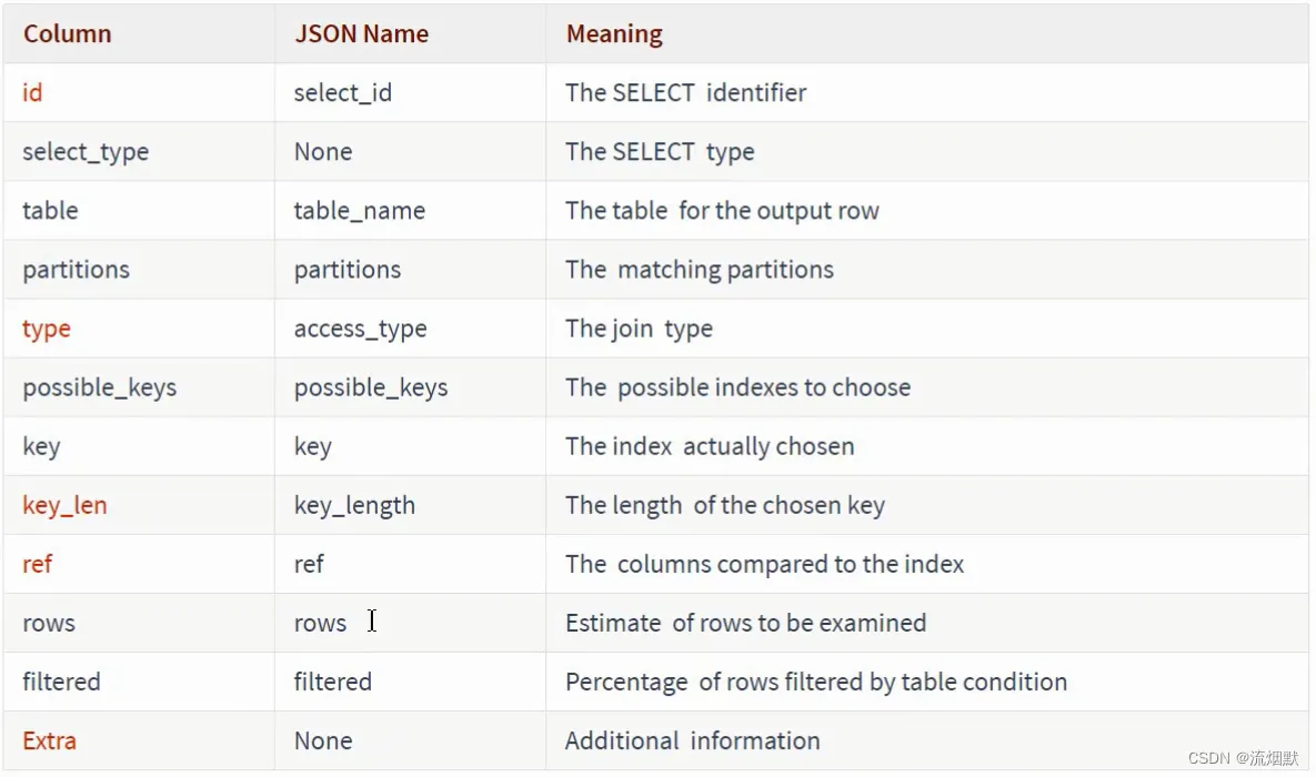Explain的column与json的对应关系(来源于MySQL5.7文档)