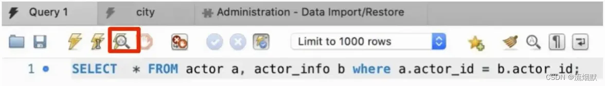 可视化输出,可以通过MySQL Workbench可视化查看MySQL的执行计划。通过点击Workbench的放大镜图标,即可生成可视化的查询计划。