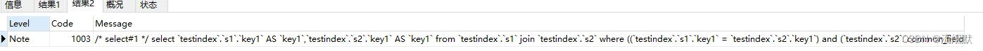 可以看到show WARNINGS;展示出来的信息有三个字段,分别是level、code、message。我们最常见的就是code为1003的信息,当code为1003时,message字段展示的信息类似于查询优化器将我们的查询语句重写后的语句。