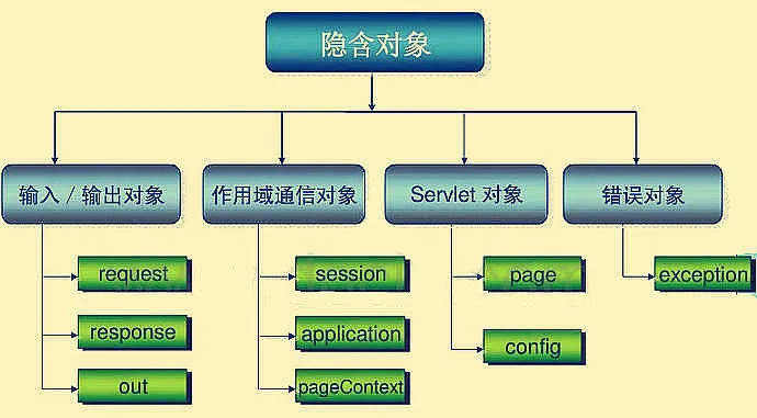Exception getException( )回传目前网页的异常,不过此网页要为error page, JspWriter getOut( )回传目前网页的输出流,例如:out Object getPage( )回传目前网页的Servlet 实体(instance),例如:page ServletRequest getRequest( )回传目前网页的请求,例如:request ServletResponse getResponse( )回传目前网页的响应,例如:response ServletConfig getServletConfig( )回传目前此网页的ServletConfig 对象,例如:config ServletContext getServletContext( ) 回传目前此网页的执行环境(context),例如:application HttpSession getSession( )回传和目前网页有联系的会话(session),例如:session