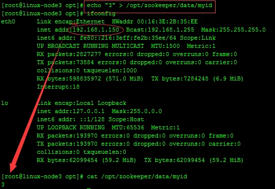 #在192.168.1.150服务器上面创建myid文件,并设置值为1,同时与zoo.cfg文件里面的server.3保持一致,如下